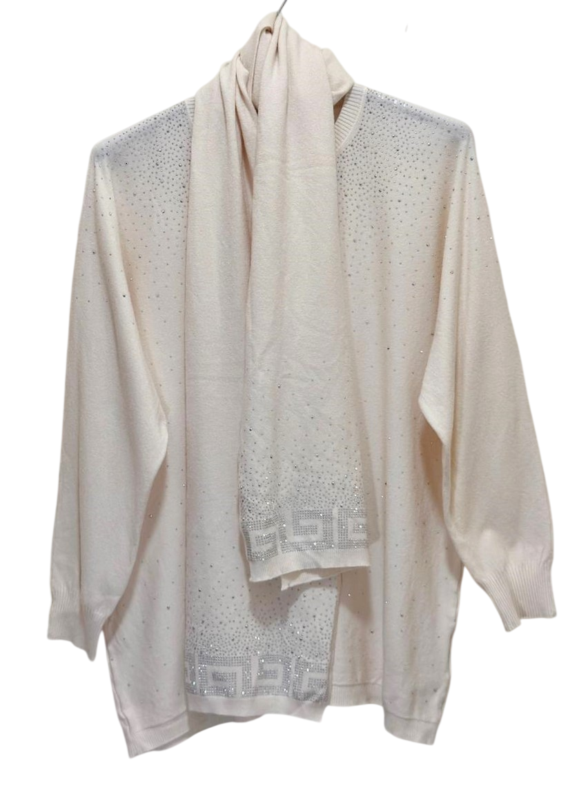 Pink sweater with sparkly Diamante across shoulders, front and on Matching scarf