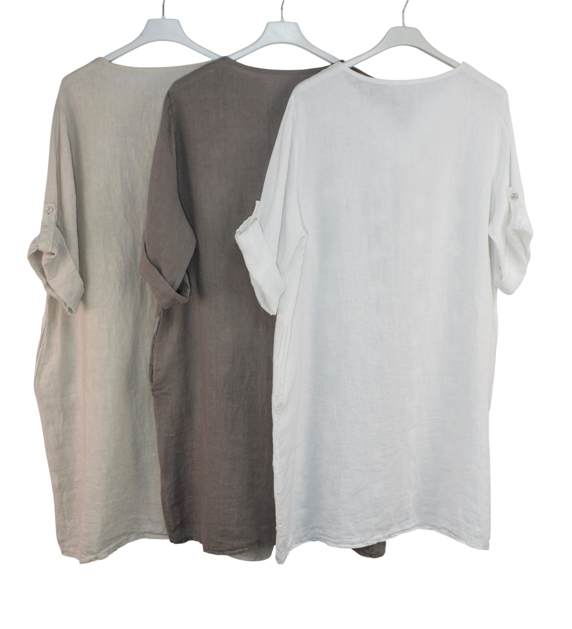 Experience effortless summer style with this Italian Lagenlook A-line tunic dress. Crafted from soft, lightweight 100% linen, it features elegant abstract geometric embroidery and a flattering round split neckline. The 3/4 button tab sleeves and convenient side pockets combine practicality with chic design. Made in Italy, this one-size dress offers breathable comfort and timeless appeal, perfect for warm days.